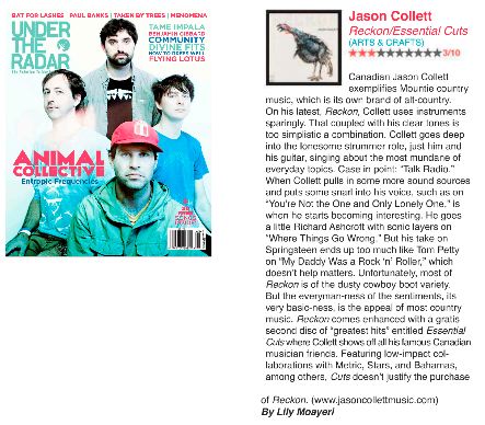 Canadian Jason Collett exemplifies Mountie country music, which is its own brand of alt.country. On his latest, Reckon, Collett uses instruments sparingly. That, coupled with his clear tones is too simplistic a combination. Collett goes deep into the lonesome strummer role, just him and his guitar, singing about the most mundane of everyday topics. Case in point, “Talk Radio.” When Collett pulls in some more sound sources and puts some snarl into his voice, such as on “You’re Not The One And Only Lonely One,” is when he starts becoming interesting. He goes a little Richard Ashcroft with sonic layers on “Where Things Go Wrong.” But his take on Springsteen ends up too much like Tom Petty on “My Daddy Was A Rock ‘n’ Roller,” which doesn’t help matters. Unfortunately, most of Reckon is of the dusty cowboy boot variety. But the everyman-ness of the sentiments, its very basic-ness, is the appeal of most country music. Reckon comes enhanced with a gratis second disc of “greatest hits” entitled Essential Cuts where Collett shows off all his famous Canadian musician friends. Featuring low-impact collaborations with Metric, Stars, Bahamas, among others, Cuts doesn’t justify purchase of Reckon.