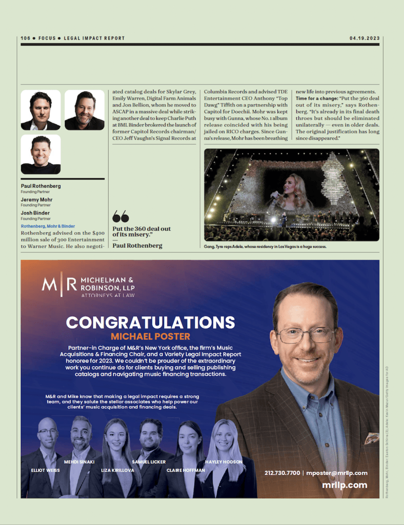 Profiled music attorneys Jason Boyarski, Eugene Salomon, Jr., Ethan Schiffres, Donald S. Passman, David Lande, David Byrnes, Paul Rothenberg, Jeremy Mohr, Josh Binder, Bobby Rosenbloum, Jess Rosen, Jeff Biederman, Steve Plinio and Paul Shindler for the Power of Law for Variety April 19, 2023 Issue: