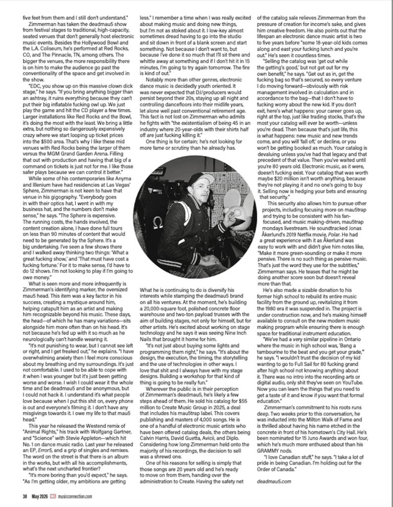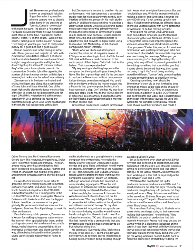 Joel Zimmerman aka deadmau5 interviewed for the cover of Music Connection Magazine May 2026:
